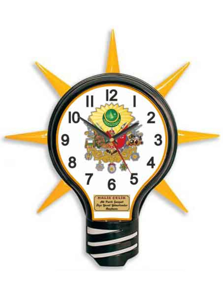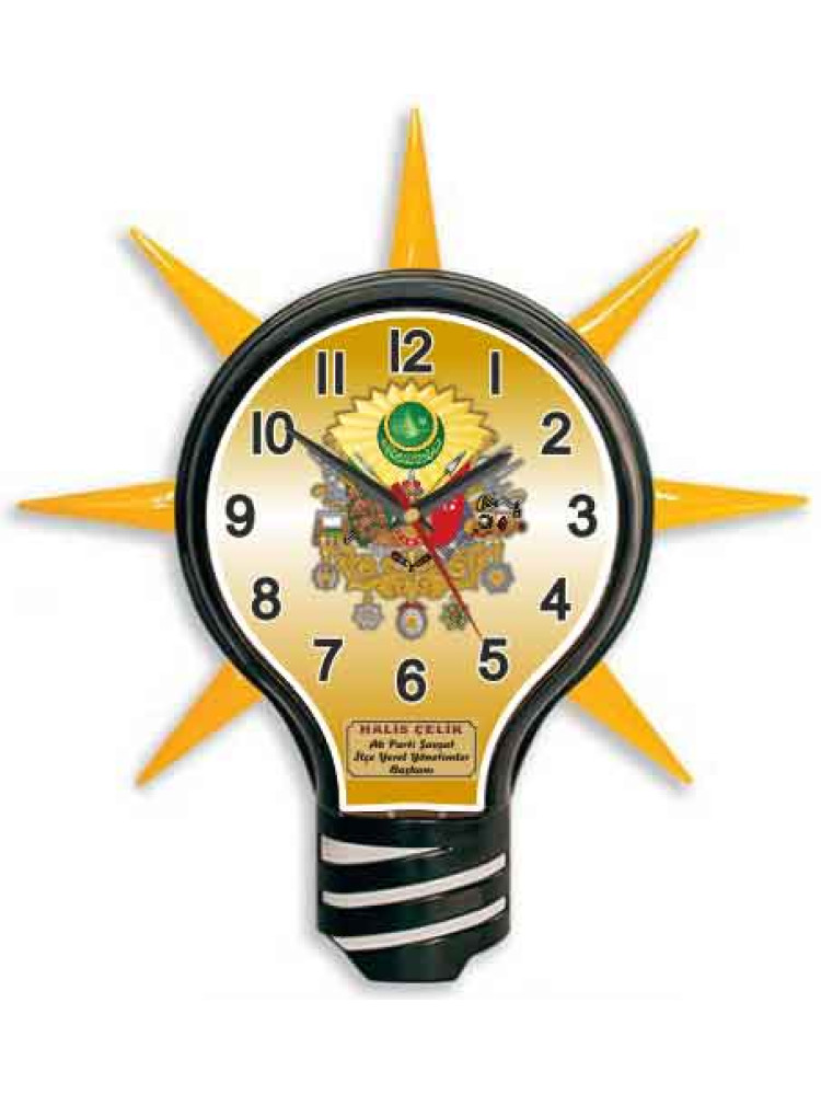 Ampul şeklinde osmanlı arması resimli dekoratif ampul duvar saatini, akp reklamı amacıyla parti odası, ofis ve makam odası için en güzel duvar saati olarak satın alabilirsiniz.
