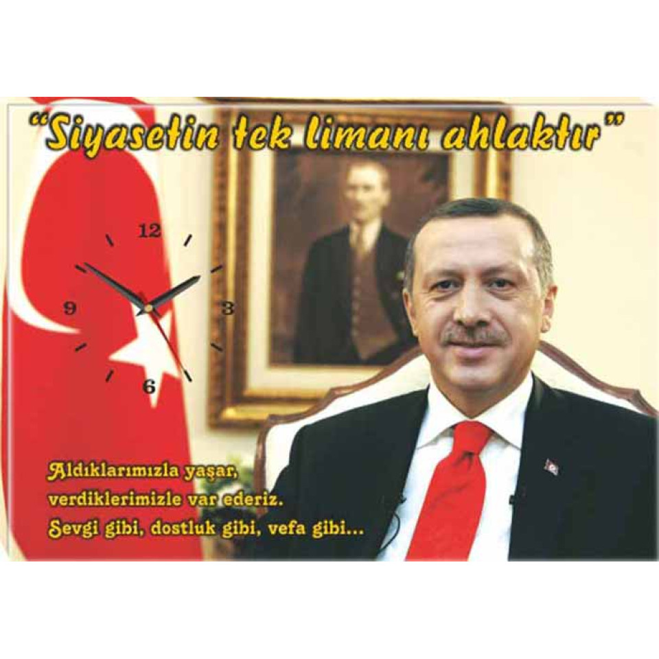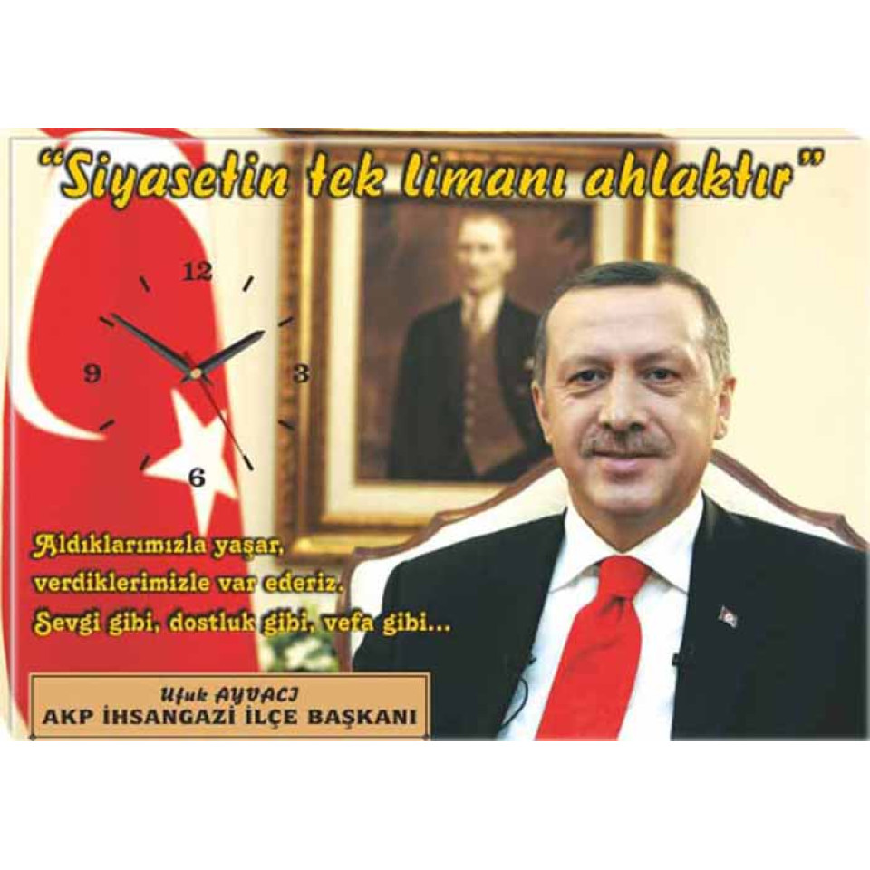 Yüksek çözünürlükte net ve kaliteli basılmış cumhurbaşkanı Recep Tayyip Erdoğan ve siyasetle ilgili sözü yazılı saatli tabloyu akp reklamı amacıyla parti odası, ofis ve makam odası için en güzel kanvas duvar saati olarak büyük boy satın alabilirsiniz