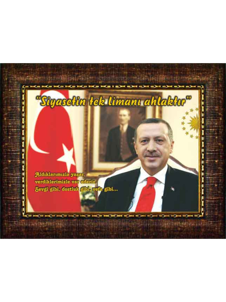 Yüksek çözünürlükte net ve kaliteli basılmış Erdoğanın siyasetle ilgili sözü yazılı en güzel cumhurbaşkanı Recep Tayyip Erdoğan resmini akp reklamı amacıyla parti odası, ofis ve makam odası için çerçeveli resim olarak büyük boy satın alabilirsiniz.