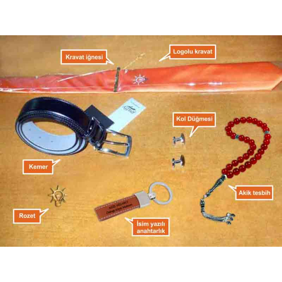 - 1 adet Kravat - Akp logosu işlemeli turuncu renk kravat.