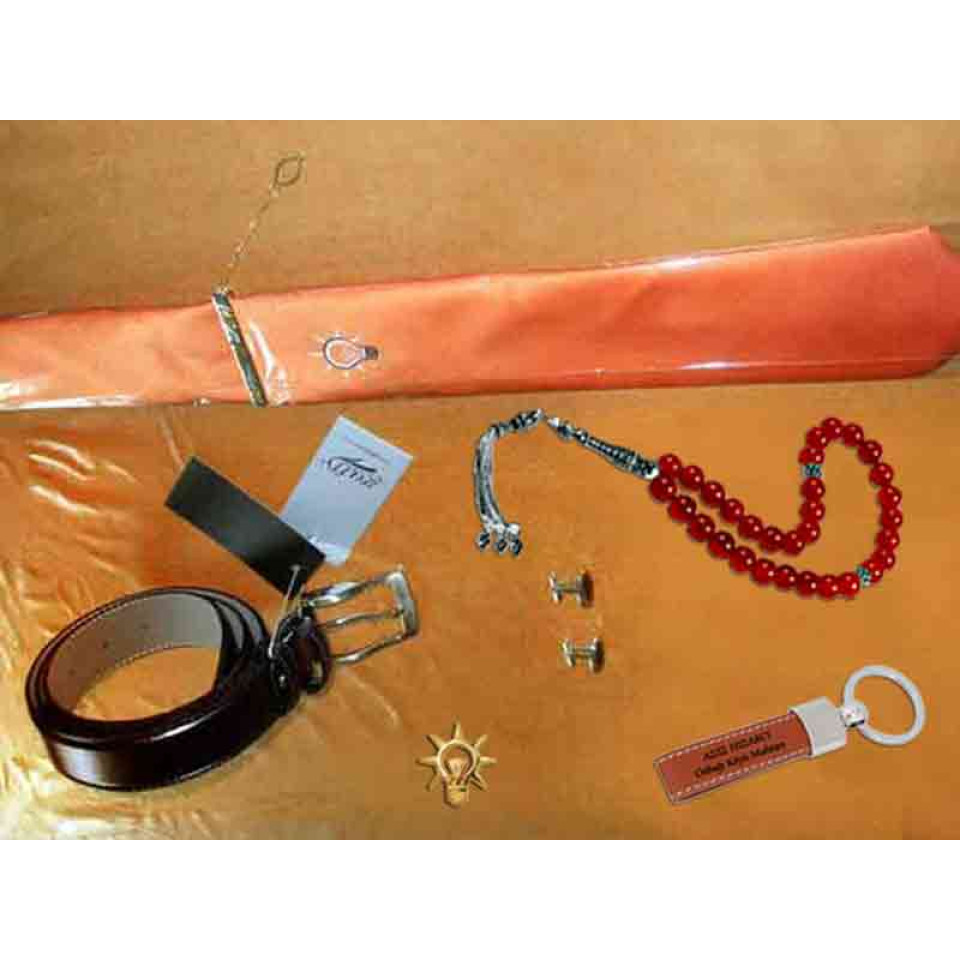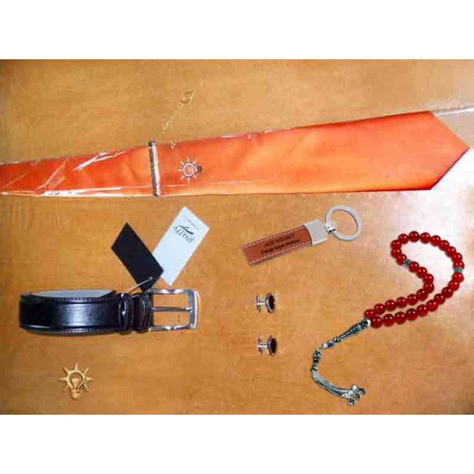 Akp logosu ampul işlemeli kravat, kravat iğnesi, kemer, kol düğmesi ve akp rozetini takım halinde en güzel kravat seti olarak satın alabilirsiniz.