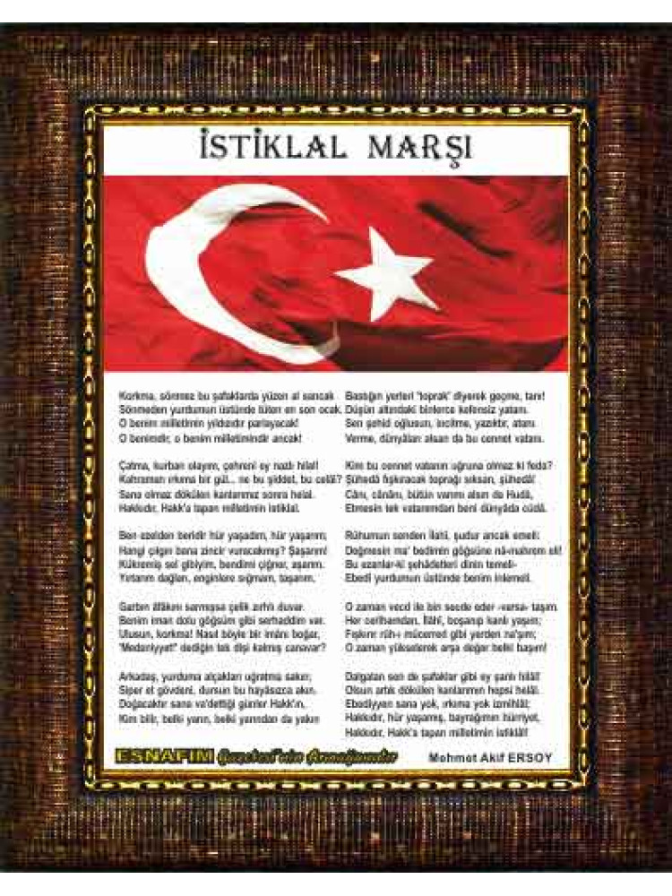 Yüksek çözünürlükte net ve kaliteli basılmış en güzel istiklal marşı resmini okul, ofis, makam odası ve resmi kurumlar için çerçeveli resim olarak büyük boy satın alabilirsiniz.