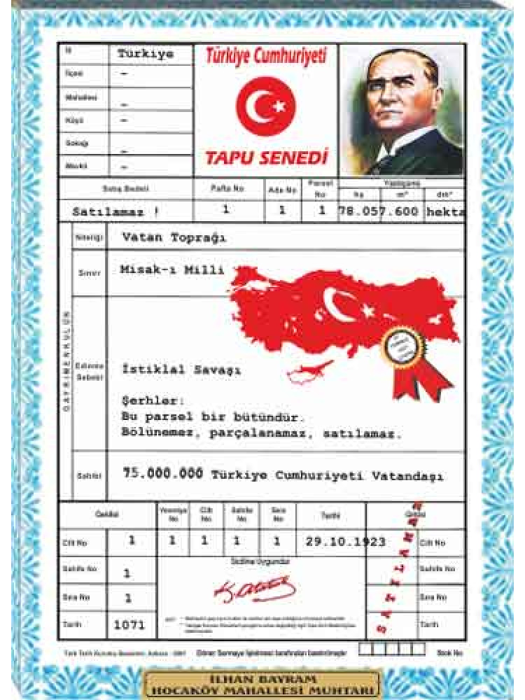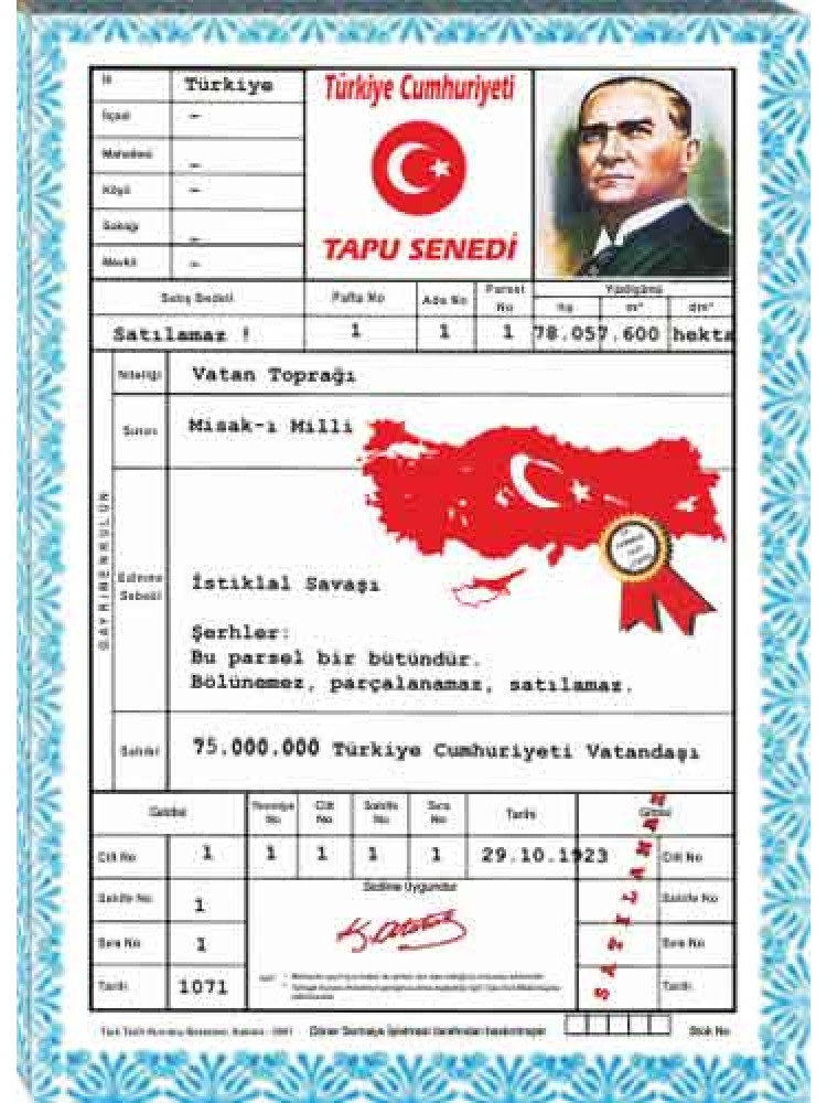 Yüksek çözünürlükte net ve kaliteli basılmış en güzel Türkiye tapusu tablosunu okul, ofis, makam odası ve resmi kurumlar için kanvas tablo olarak büyük boy satın alabilirsiniz.