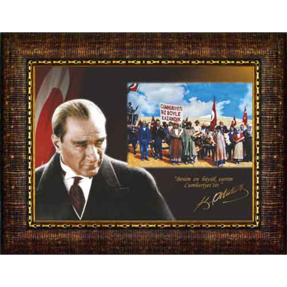 Atatürk Tablosu Çerçeveli - Cumhuriyeti Biz Böyle Kazandık Temalı Yatay ATACRAP44Y