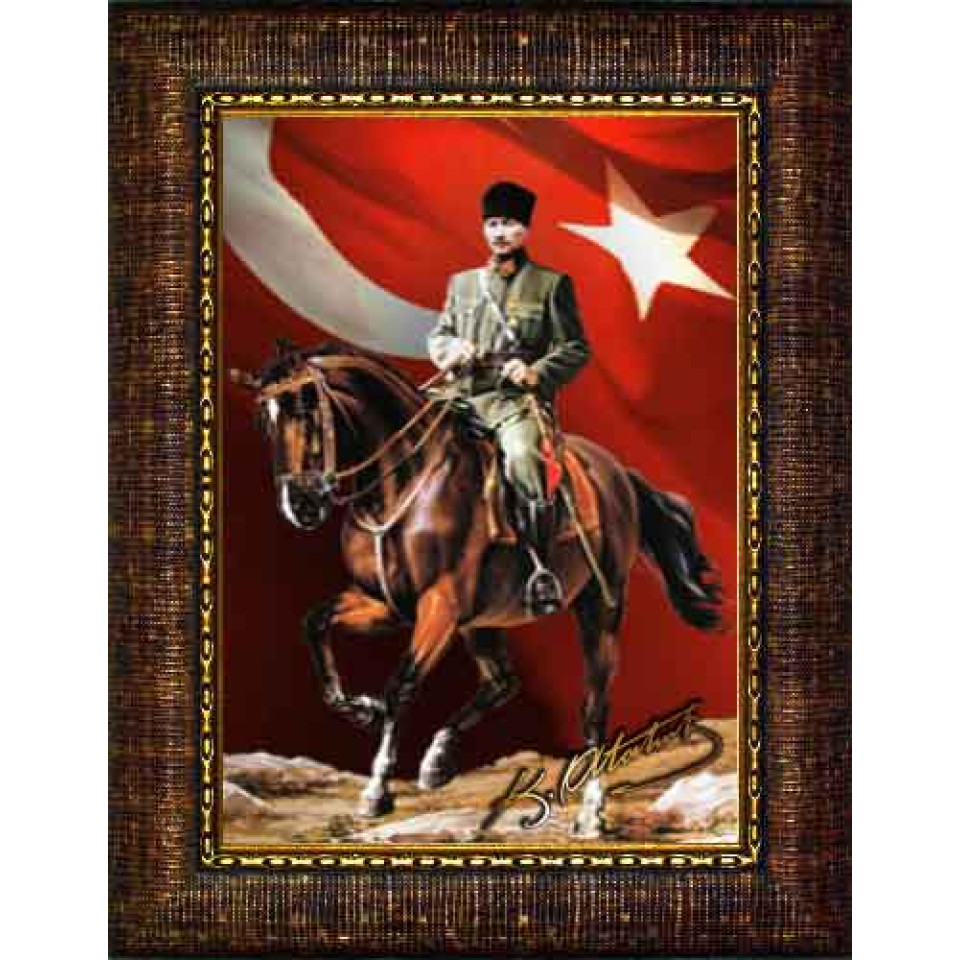 Atatürk Tablosu Çerçeveli - At Üstünde Bayraklı Tasarım ATACRAP86D