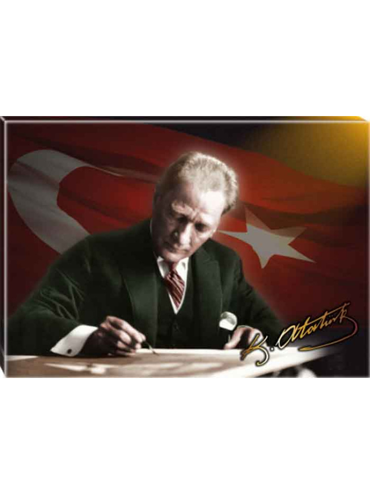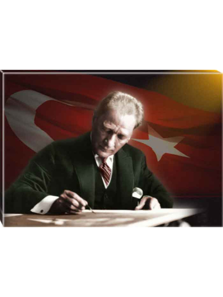 Atatürk Tablosu Kanvas - Masa Başında Yazı Yazan Bayraklı Yatay ATATRAP18Y