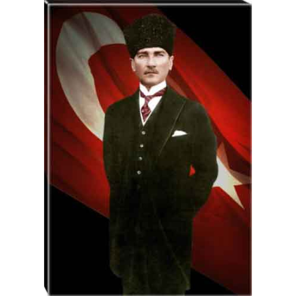 Atatürk Tablosu Kalpaklı Kanvas - Bayraklı Ayakta Boydan ATATRAP57D