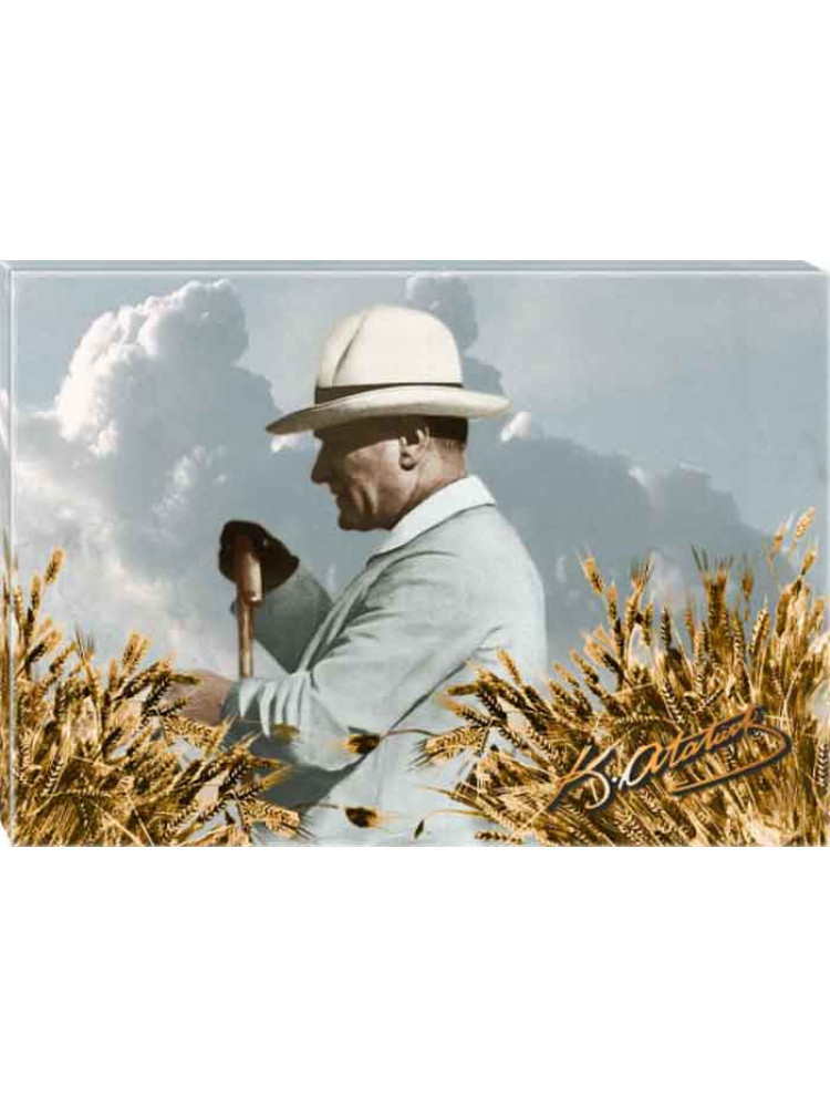 Atatürk Tablosu Kanvas - Buğday Başakları Arasında Tarlada Çiftçi Yandan Profil Yatay ATATRAP66Y