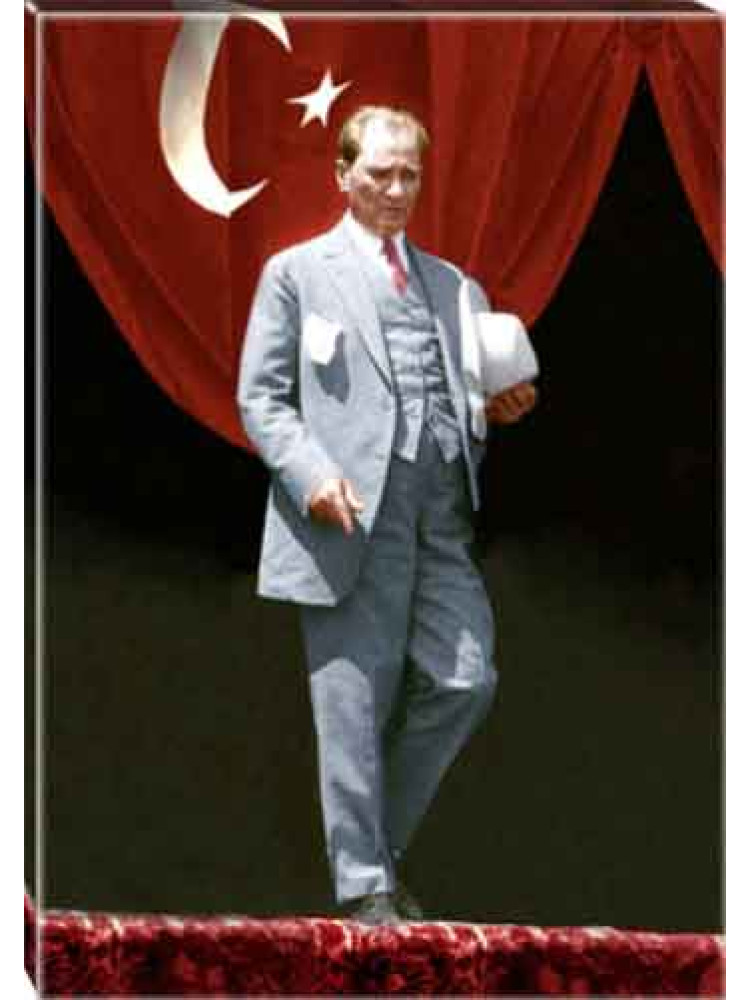 Atatürk Tablosu Kanvas - Ayakta Boydan Elinde Şapkalı Bayraklı Tasarım ATATRAP84D