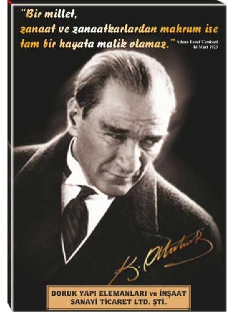 Mustafa Kemal Atatürk’ün anlamlı sözleriyle hazırlanan bu özel tablo modeli; ofis, okul, kurum, dernek ve ev dekorasyonunda hem görsel hem de mesaj veren bir kullanım sunmak isteyenler için hazırlanmıştır. Yüksek kaliteli baskı ile sunulan bu ürün, bulunduğu ortama estetik, dikkat çekici ve anlamlı bir hava katar.