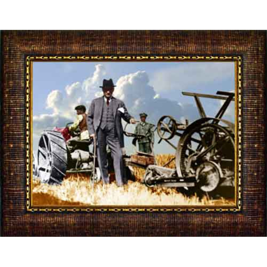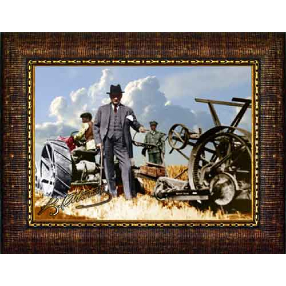 Atatürk Tablosu Çerçeveli - Traktör Başında Tarlada Çiftçi Yatay ATACRAP67Y