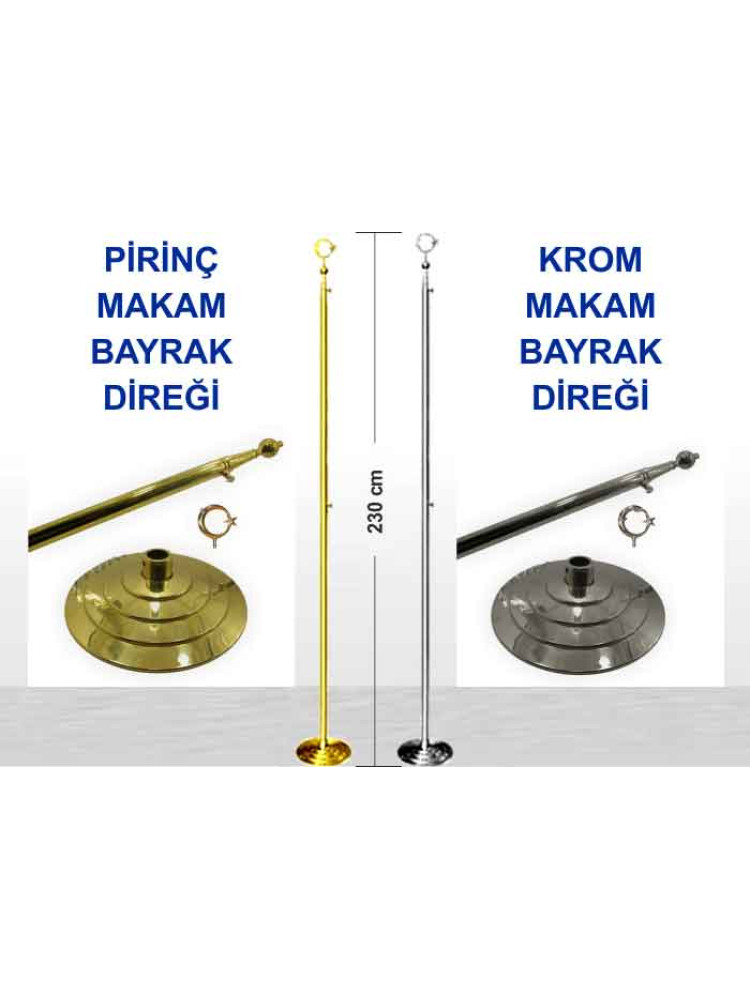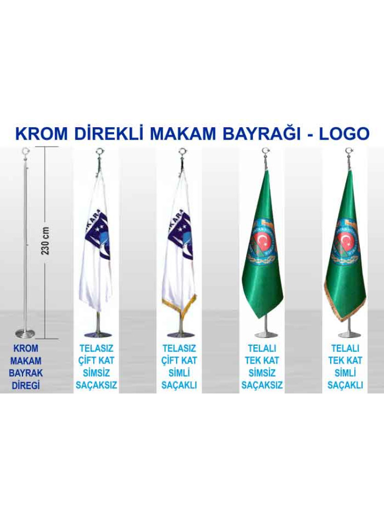 Krom ve pirinç direkli büyük makam bayrağı, resmi kurumlar, ofisler, toplantı alanları ve makam odalarında düzenli, saygın ve dikkat çekici bir görünüm oluşturmak isteyenler için hazırlanmıştır. Logolu bayrak modeliyle kurumsal kullanım için uygun şık ve güçlü bir duruş sunar.