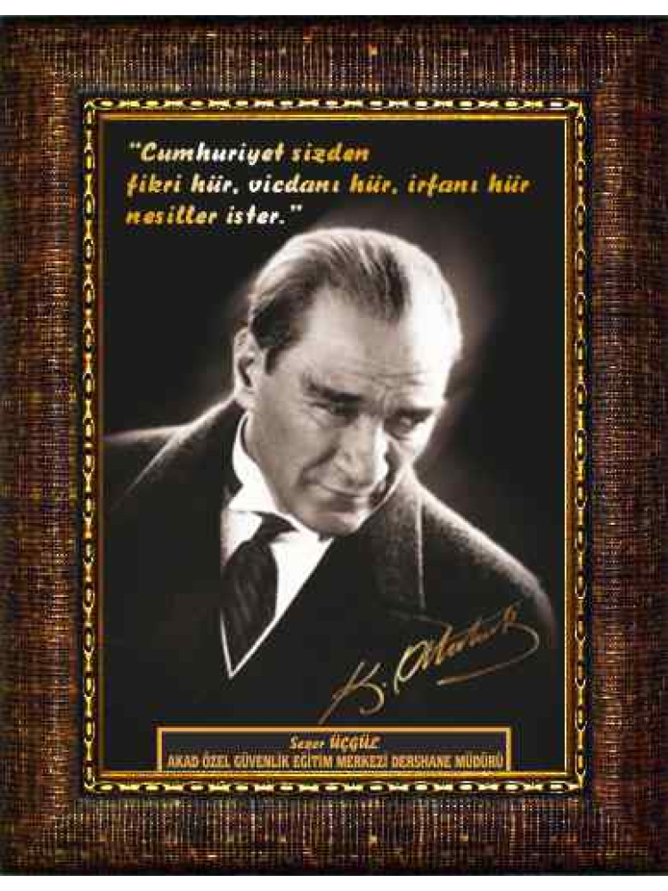 Mustafa Kemal Atatürk’ün anlamlı sözleriyle hazırlanan bu özel tablo modeli; ofis, okul, kurum, dernek ve ev dekorasyonunda hem görsel hem de mesaj veren bir kullanım sunmak isteyenler için hazırlanmıştır. Yüksek kaliteli baskı ile sunulan bu ürün, bulunduğu ortama estetik, dikkat çekici ve anlamlı bir hava katar.