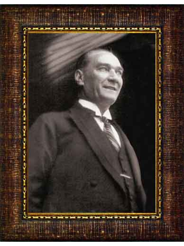 Mustafa Kemal Atatürk portresi içeren bu çerçeveli tablo, makam odası, ofis, okul, kurum ve ev dekorasyonunda anlamlı ve güçlü bir görünüm oluşturmak isteyenler için hazırlanmıştır. Yüksek kaliteli baskı ile sunulan bu model, bulunduğu ortama estetik, düzenli ve dikkat çekici bir hava katar.