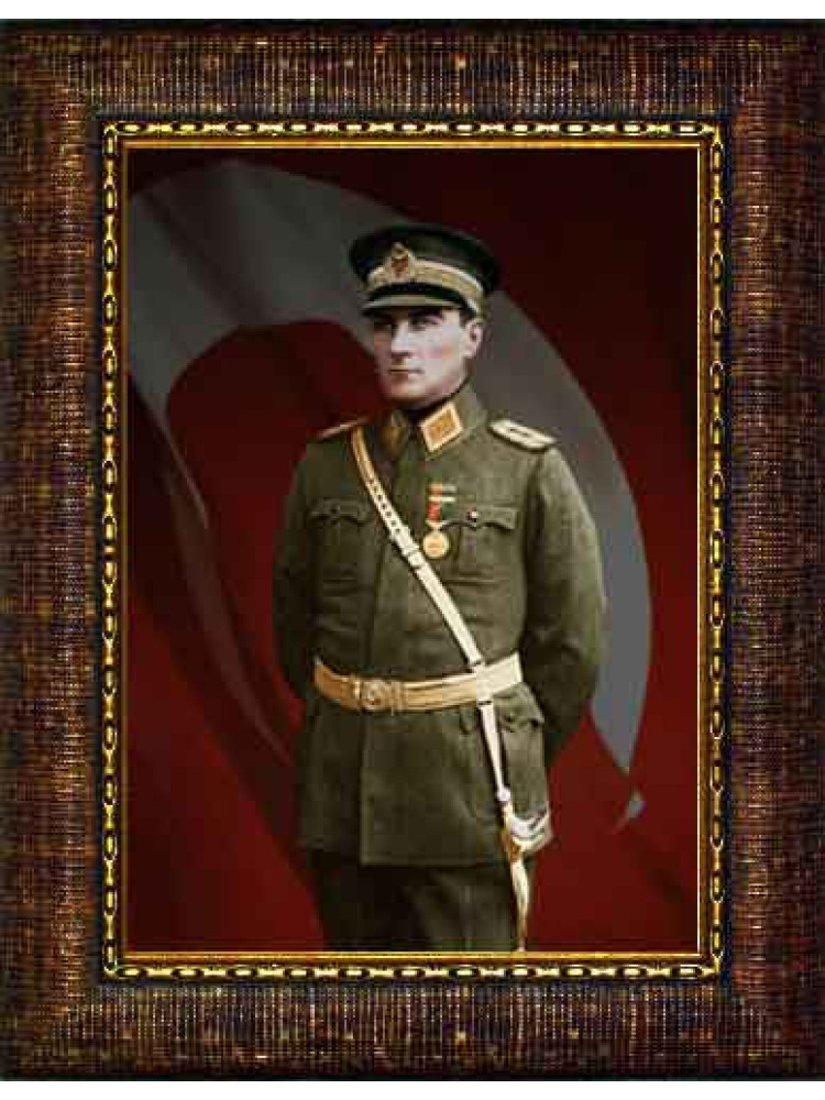 Mustafa Kemal Atatürk portresi içeren bu çerçeveli tablo, makam odası, ofis, okul, kurum ve ev dekorasyonunda anlamlı ve güçlü bir görünüm oluşturmak isteyenler için hazırlanmıştır. Yüksek kaliteli baskı ile sunulan bu model, bulunduğu ortama estetik, düzenli ve dikkat çekici bir hava katar.