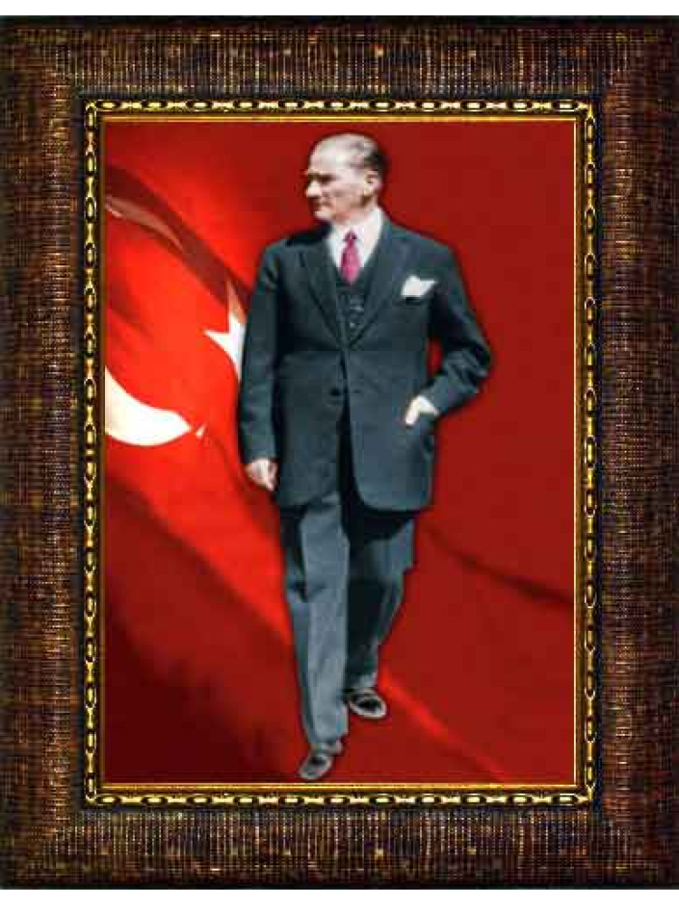 Ayakta Boydan Bayraklı Tasarım, atatürk tablosu, çerçeveli atatürk tablosu, atatürk portresi