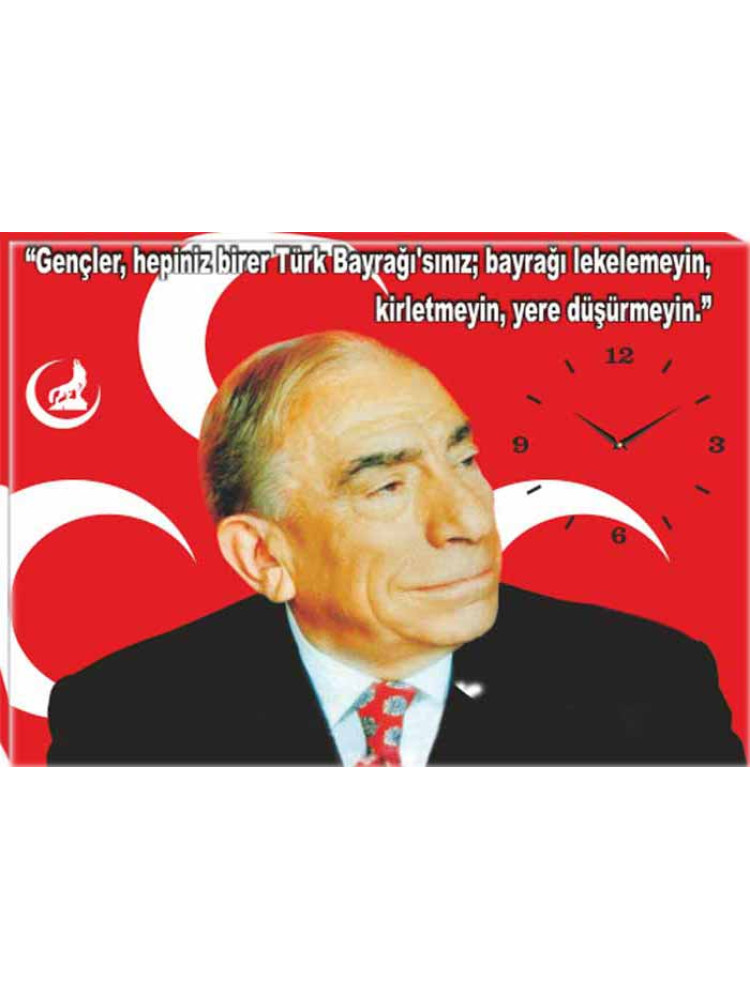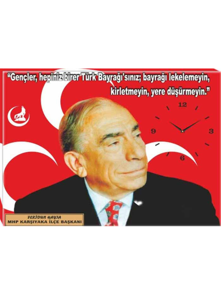 Yüksek çözünürlükte net ve kaliteli basılmış en güzel Alparslan Türkeş ve gençlerle ilgili sözü yazılı tablo saatini mhp reklamı amacıyla parti odası, ofis ve makam odası için kanvas duvar saati olarak büyük boy satın alabilirsiniz.