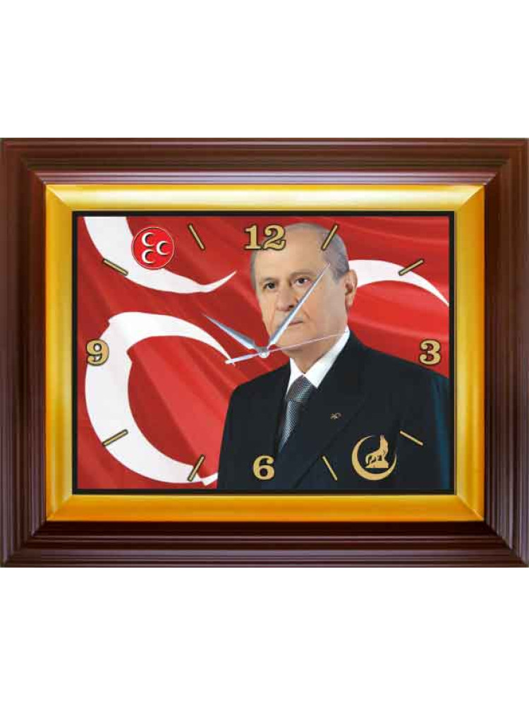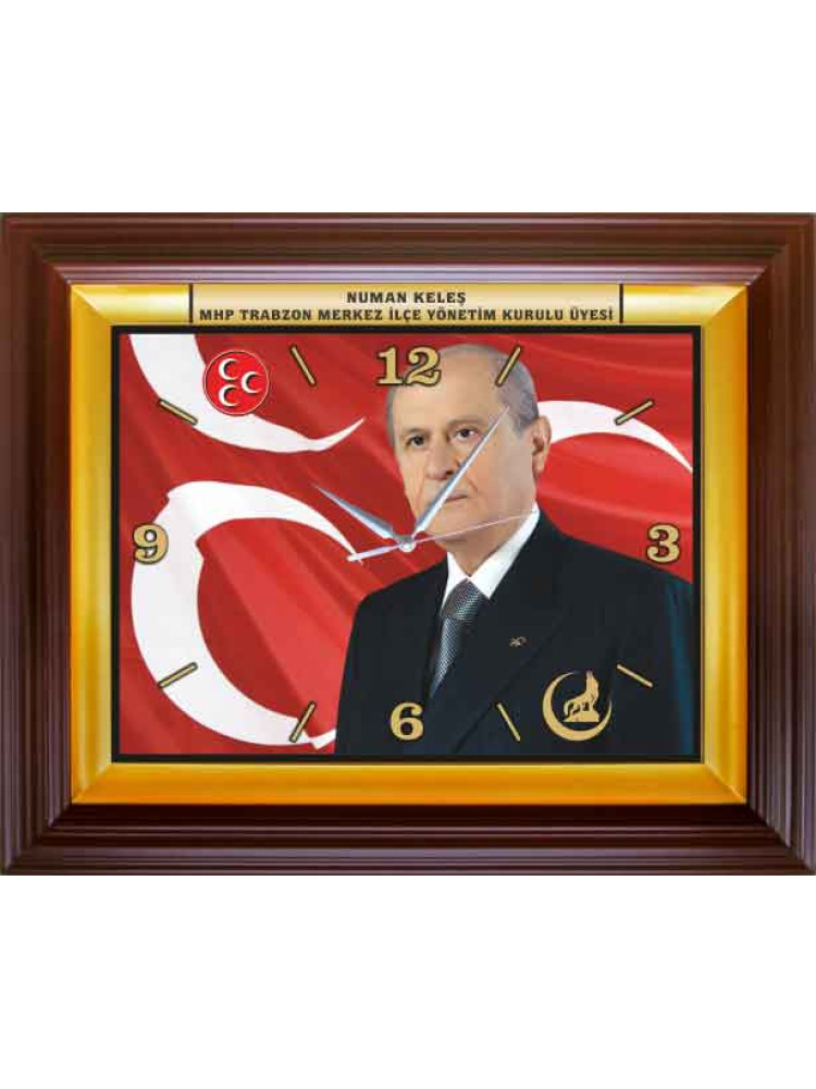 Devlet Bahçeli resimli dekoratif dikdörtgen duvar saatini, mhp reklamı amacıyla parti odası, ofis ve makam odası için en güzel duvar saati olarak satın alabilirsiniz.