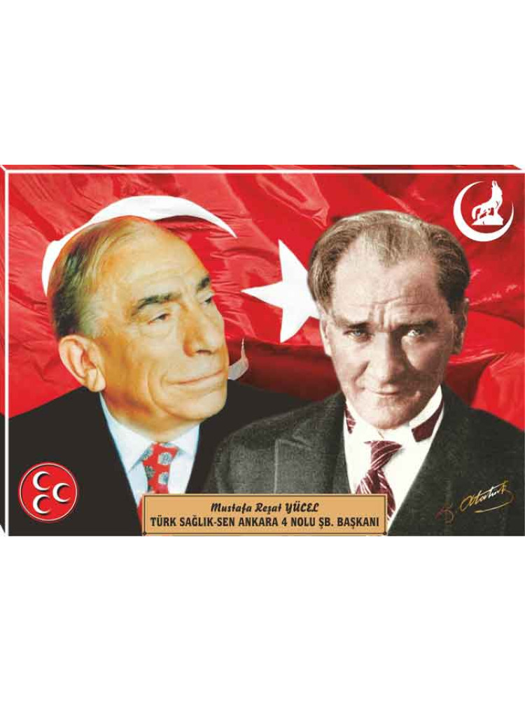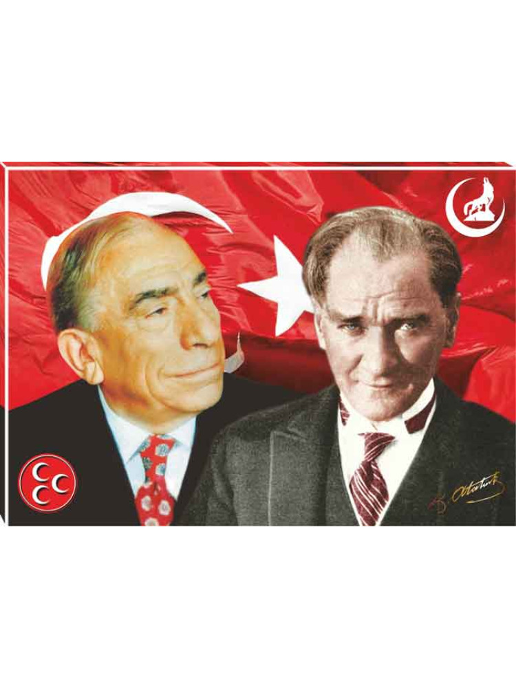 Yüksek çözünürlükte net ve kaliteli basılmış en güzel Alparslan Türkeş ve Atatürk yanyana tablosunu mhp reklamı amacıyla parti odası, ofis ve makam odası için kanvas tablo olarak büyük boy satın alabilirsiniz.