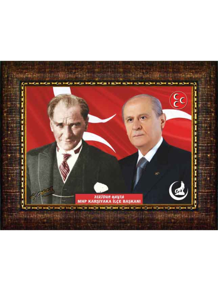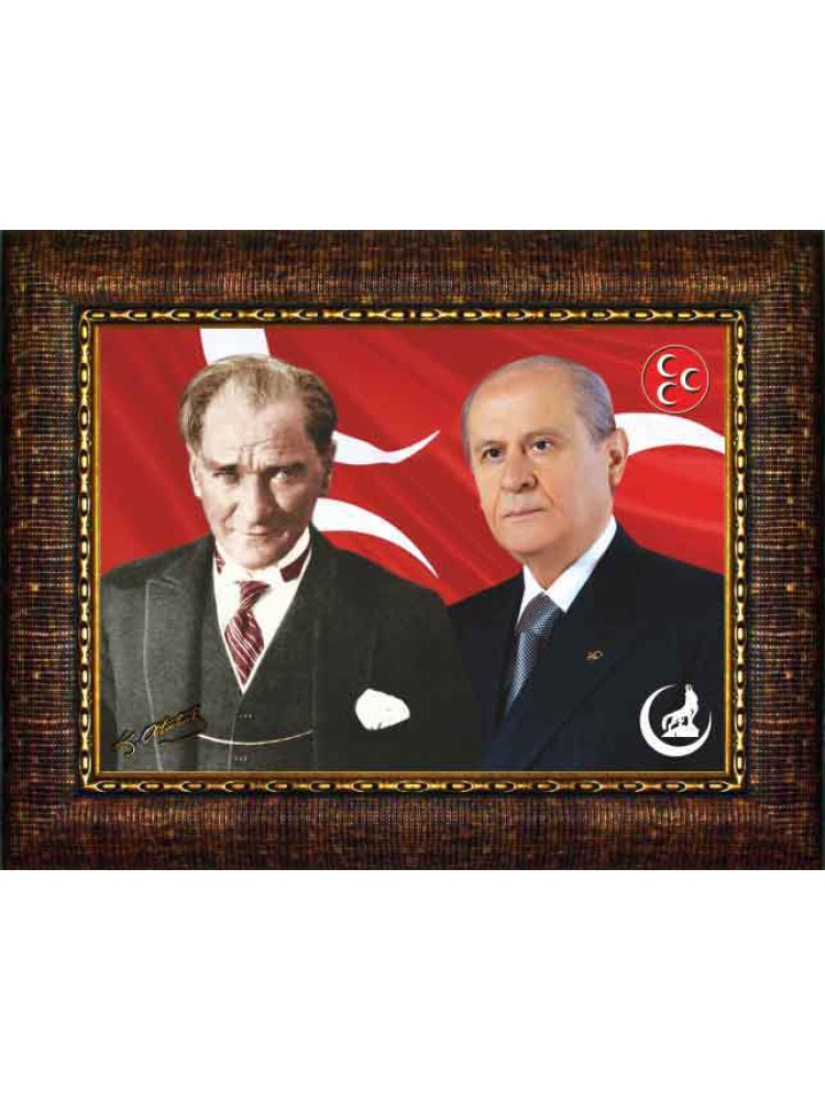 Yüksek çözünürlükte net ve kaliteli basılmış en güzel Devlet Bahçeli ve Atatürk yanyana resmini mhp reklamı amacıyla parti odası, ofis ve makam odası için çerçeveli resim olarak büyük boy satın alabilirsiniz.
