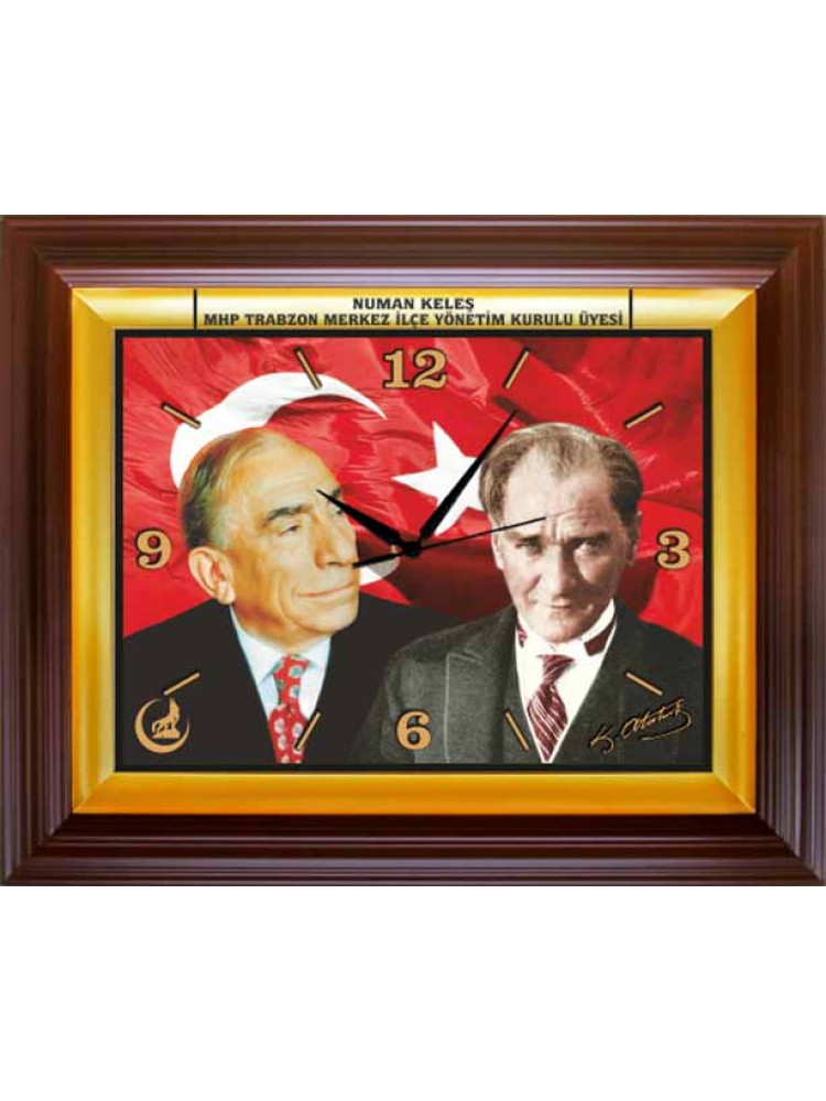 Alparslan Türkeş ve Atatürk yanyana resimli dekoratif dikdörtgen duvar saatini, mhp reklamı amacıyla parti odası, ofis ve makam odası için en güzel duvar saati olarak satın alabilirsiniz.