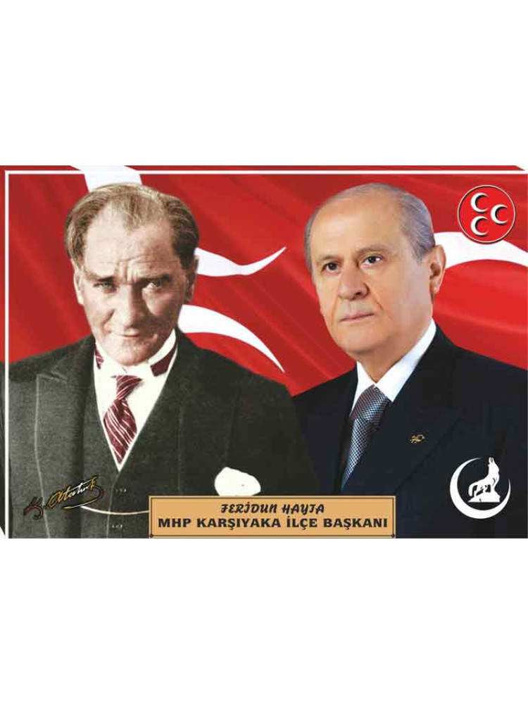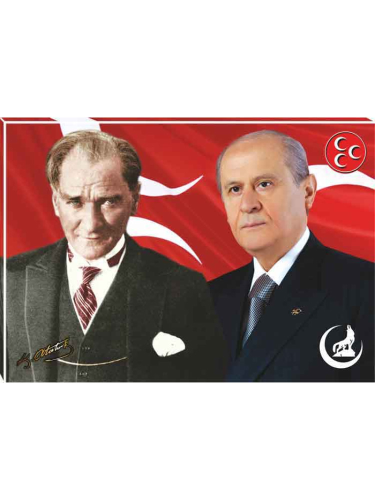 Yüksek çözünürlükte net ve kaliteli basılmış en güzel Devlet Bahçeli ve Atatürk yanyana tablosunu mhp reklamı amacıyla parti odası, ofis ve makam odası için kanvas tablo olarak büyük boy satın alabilirsiniz.