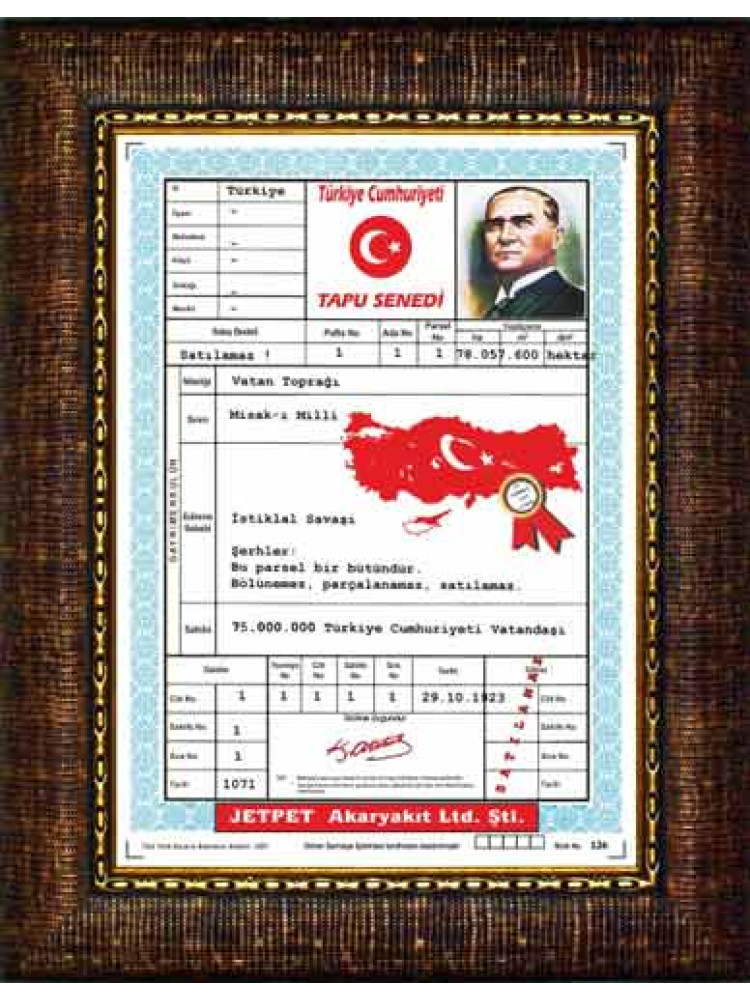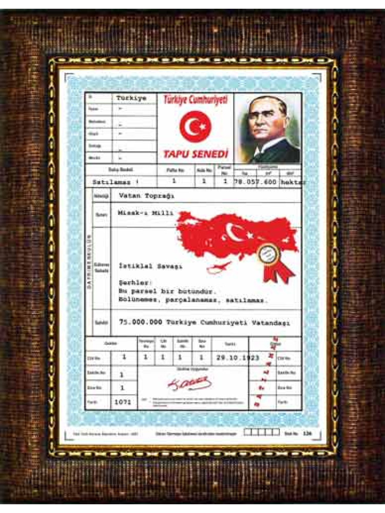 Yüksek çözünürlükte net ve kaliteli basılmış en güzel Türkiye tapusu resmini okul, ofis ve makam odası için çerçeveli resim olarak büyük boy satın alabilirsiniz.